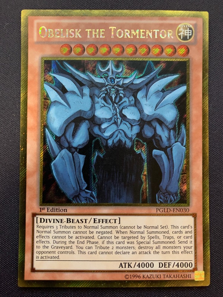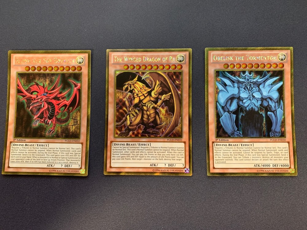 1x Yugioh! The Winged Dragon of Ra - Gold Secret Rare - Unlimited Edition PGLD-EN031 Near Mint 1x Yugioh! Slifer the Sky Dragon - Gold Secret Rare - 1st Edition - PGLD-EN032 - Near Mint 1x Yugioh! Obelisk the Tormentor - Gold Secret Rare - 1st Edition - PGLD-EN030 - Near Mint