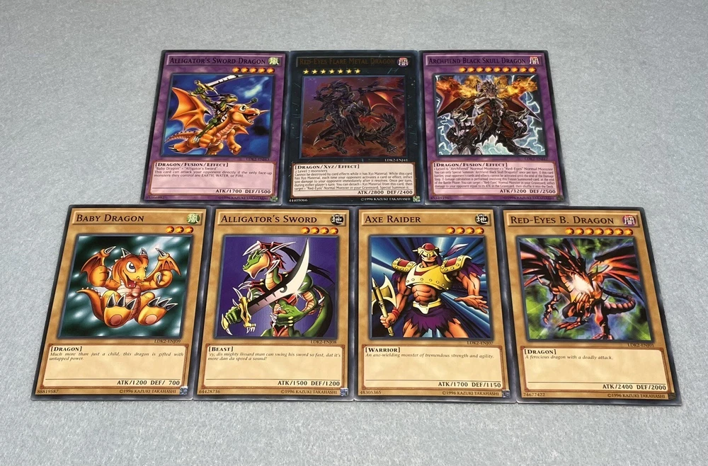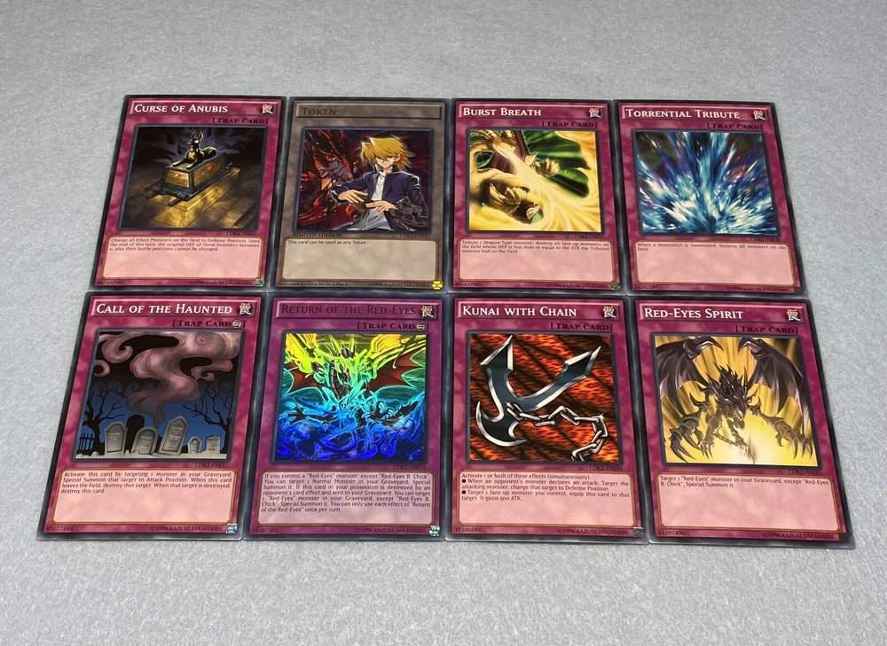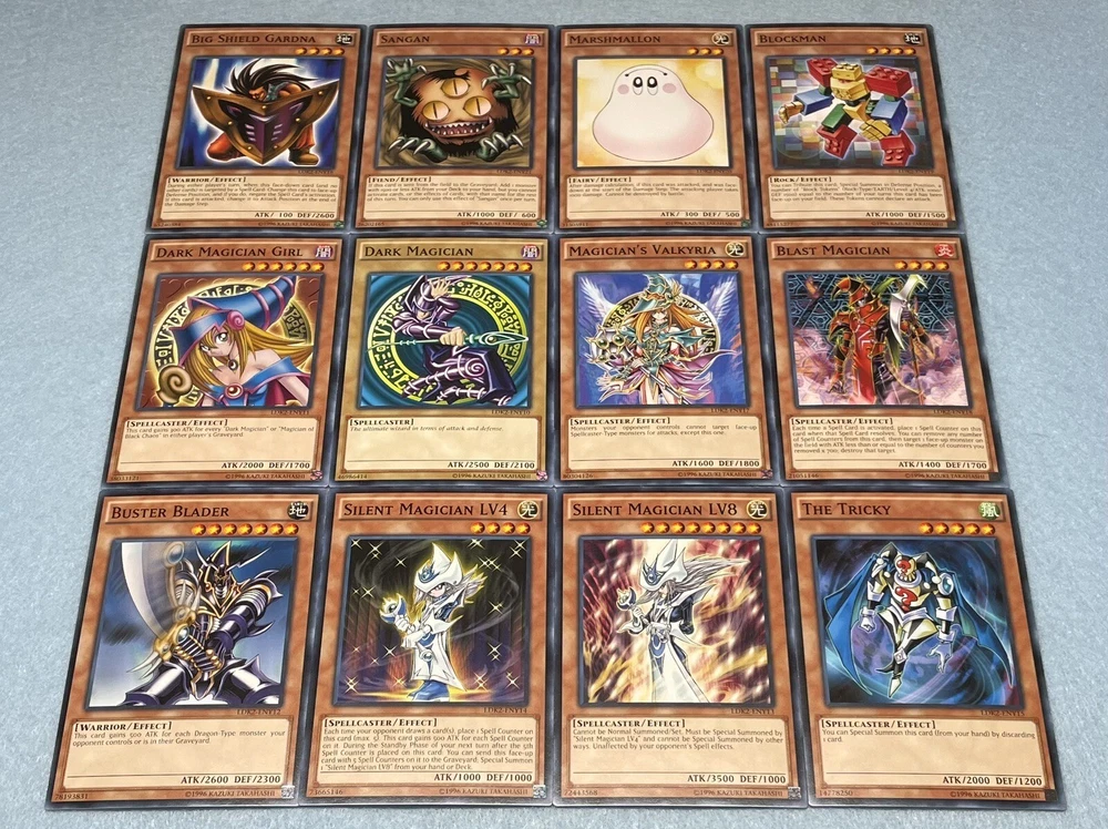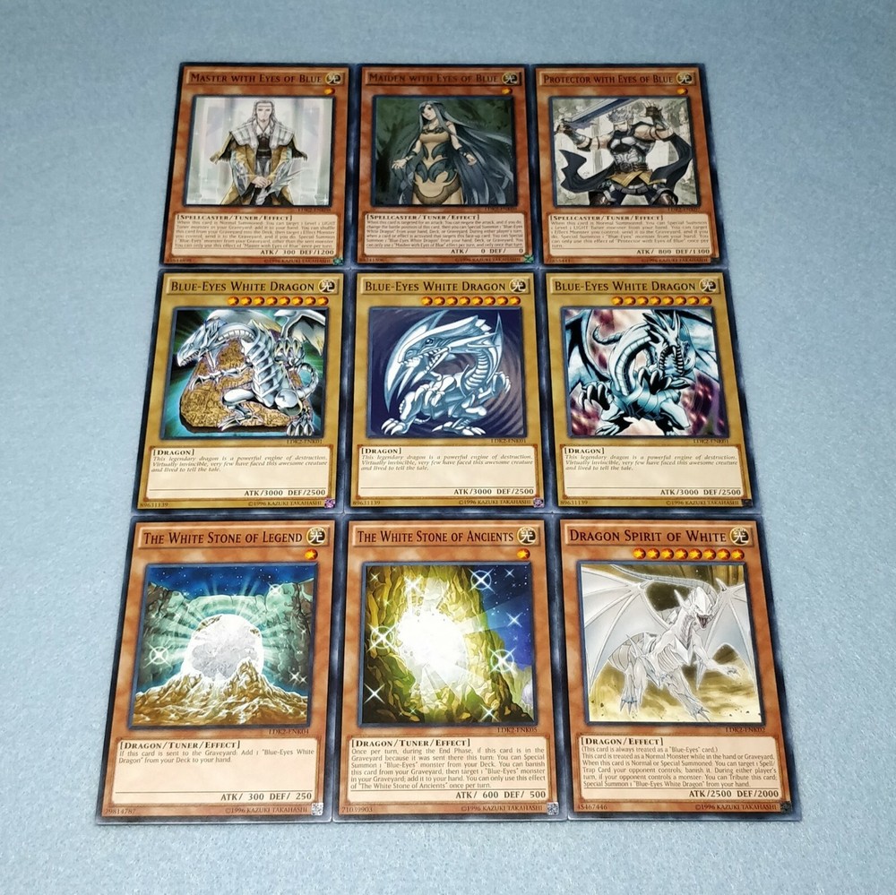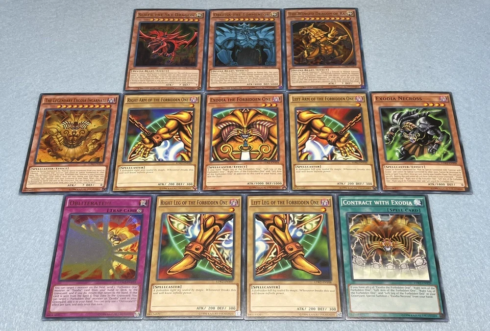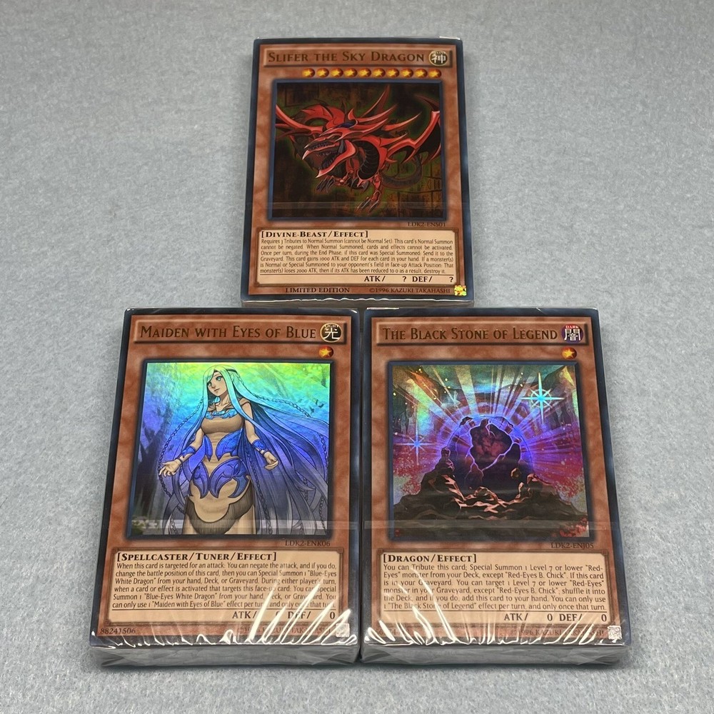 Includes some of the most iconic cards used by the three main protagonists of Yu-Gi-Oh Duel Monsters. You will receive the following cards: Yami Yugi's Exodia Deck: 1x Slifer the Sky Dragon (Ultra Rare) 1x Obelisk the Tormentor (Ultra Rare) 1x The Winged Dragon of Ra (Ultra Rare) 1x The Legendary Exodia Incarnate (Ultra Rare) 1x Ties of the Brethren (Ultra Rare) 1x Obliterate!!! (Ultra Rare) 1x Exodia the Forbidden One 1x Right Arm of the Forbidden One 1x Left Arm of the Forbidden One 1x Right Leg of the Forbidden One 1x Left Leg of the Forbidden One 1x Exodia Necross 1x Dark Magician 1x Dark Magician Girl 1x Buster Blader 1x Silent Magician LV8 1x Silent Magician LV4 1x The Tricky 1x Big Shield Gardna 1x Magician's Valkyria 1x Blast Magician 1x Blockman 1x Marshmallon 1x Sangan 1x Gold Sarcophagus 1x Swords of Revealing Light 1x Magical Dimension 1x Magicians Unite 1x Tricky Spell 4 1x Thousand Knives 1x Dark Magic Attack 1x Contract with Exodia 1x Messenger of Peace 1x Dark Factory of Mass Production 1x Monster Reincarnation 1x Secret Village of the Spellcasters 1x Pot of Duality 1x Mirror Force 1x Magical Hats 1x Magic Cylinder 1x Magician's Circle 1x Backup Soldier 1x Gravity Bind 1x Token (Ultra Rare) Seto Kaiba's Blue Eyes Deck: 3x Blue-Eyes White Dragon 1x Dragon Spirit of White 1x Kaibaman 1x The White Stone of Legend 1x The White Stone of Ancients 1x Maiden with Eyes of Blue (Ultra Rare) 1x Protector with Eyes of Blue 1x Master with Eyes of Blue 1x Battle Ox 1x La Jinn the Mystical Genie of the Lamp 1x Vorse Raider 1x Alexandrite Dragon 1x Blade Knight 1x Ancient Lamp 1x Tiger Dragon 1x Kidmodo Dragon 1x King of the Swamp 1x Rider of the Storm Winds 1x Burst Stream of Destruction 1x Beacon of White 1x Mausoleum of White 1x Polymerization 1x Enemy Controller 1x Shrink 1x Silent Doom 1x The Melody of Awakening Dragon (Ultra Rare) 1x Ancient Rules 1x Trade-In 1x Where Arf Thou? 1x Pot of Dichotomy 1x Fusion Substitute 1x Unexpected Dai 1x Negate Attack 1x Final Attack Orders 1x Shadow Spell 1x Cloning 1x Fusion Reserve 1x Jar of Avarice 1x Azure-Eyes Silver Dragon 1x Blue-Eyes Ultimate Dragon (Ultra Rare) 1x First of the Dragons 1x Token (Ultra Rare) Joey Wheeler's Red Eyes Deck: 1x Red-Eyes Black Dragon 1x Red-Eyes Black Flare Dragon 1x Red-Eyes Archfiend of Lightning 1x Red-Eyes Retro Dragon 1x The Black Stone of Legend (Ultra Rare) 1x Black Metal Dragon 1x Axe Raider 1x Alligator's Sword 1x Baby Dragon 1x Jinzo 1x Goblin Attack Force 1x Gearfried the Iron Knight 1x Rocket Warrior 1x Blue Flame Swordsman 1x Time Wizard 1x Phoenix Gearfried 1x Gemini Summoner 1x Blazewing Butterfly 1x Dark Valkyria 1x Command Knight 1x Valkyrian Knight 1x Keeper of the Shrine 1x Inferno Fire Blast 1x Red-Eyes Fusion 1x Cards of the Red Stone 1x Polymerization 1x Salamandra 1x Scapegoat 1x Foolish Burial 1x Roulette Spider 1x Supervise 1x Mystical Space Typhoon 1x Symbols of Duty 1x Return of the Red-Eyes (Ultra Rare) 1x Red-Eyes Spirit 1x Kunai with Chain 1x Call of the Haunted 1x Torrential Tribute 1x Burst Breath 1x Curse of Anubis 1x Red-Eyes Flare Metal Dragon (Ultra Rare) 1x Archfiend Black Skull Dragon 1x Alligator's Sword Dragon 1x Token (Ultra Rare) All cards are in near-mint condition.