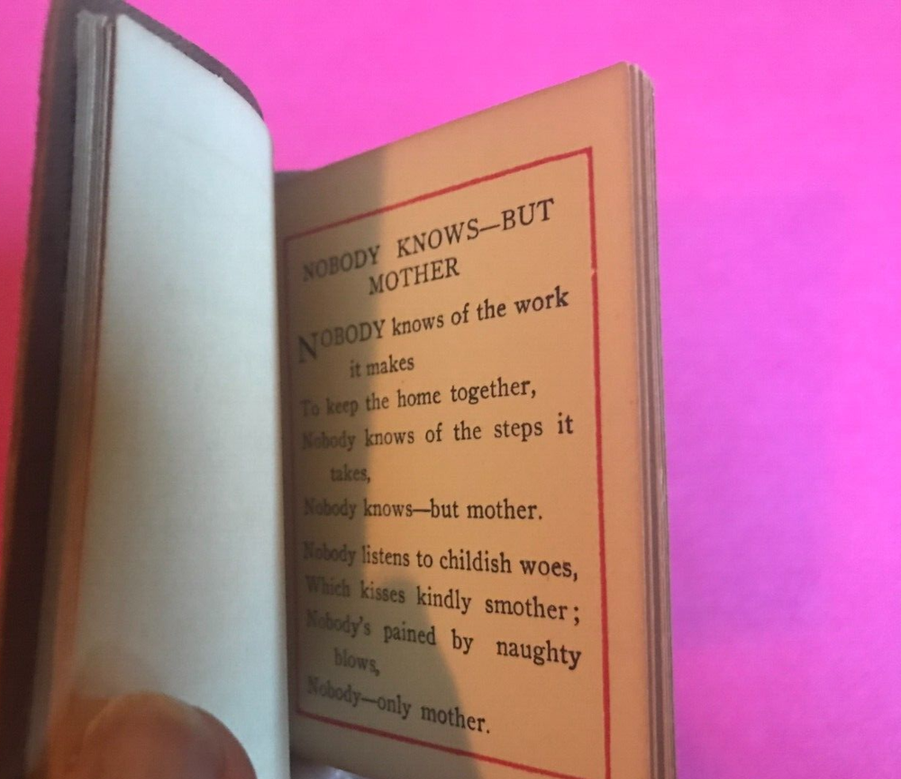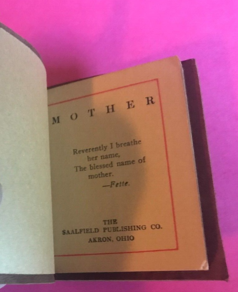 from smoke-free, pet-free home MOTHER small, miniature antique book published by Saalfield Publishing Col Akron, Ohio undated believed to be early 1900's to 1920's from the Norka series leather, suede cover with gold embellished detail on front cover book measures 3 1/4" by 2 1/2" condition - VERY GOOD with only note - one page has the teensiest chip to tip of page book will be shipped usps ground advantage with insurance (UP TO 100.00) and tracking included SELLER DOES NOT SHIP INTERNATIONALLLY NOR TO HAWAII OR ALASKA