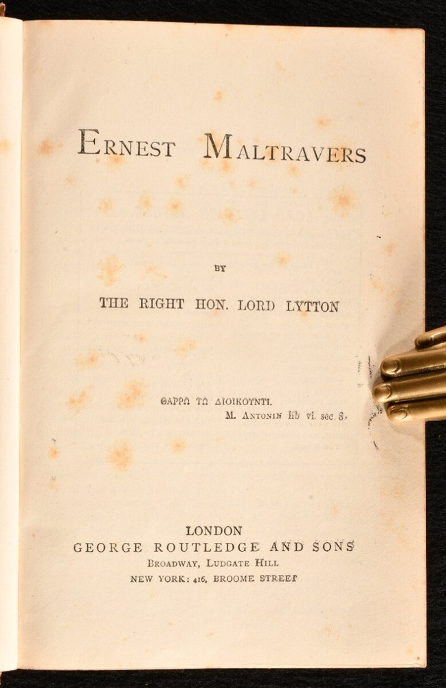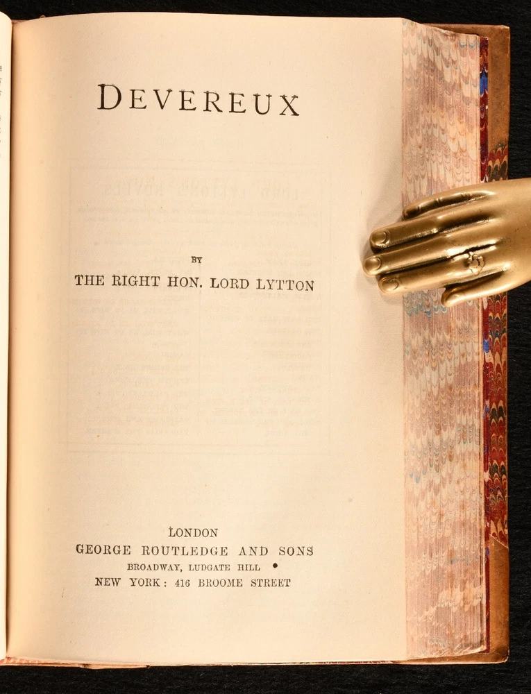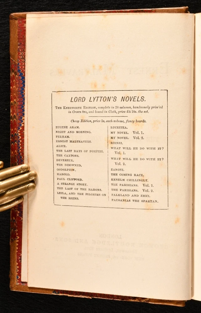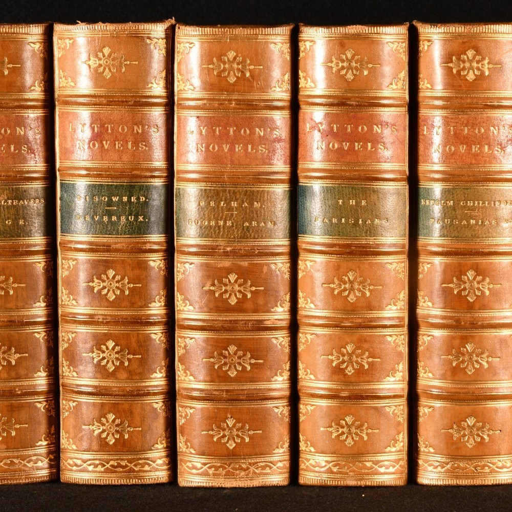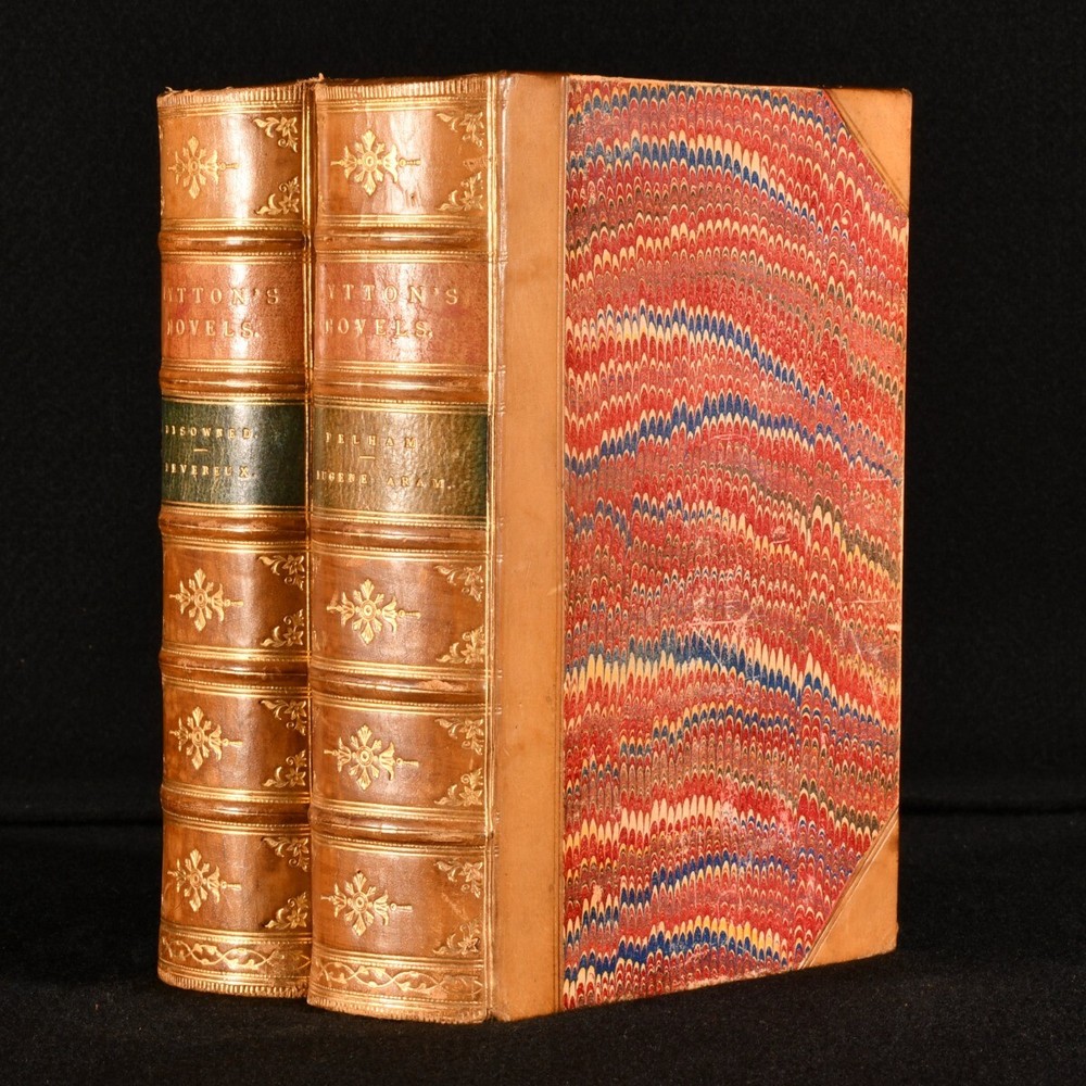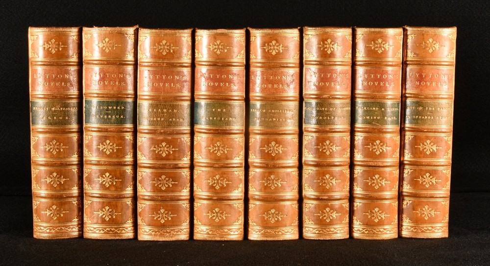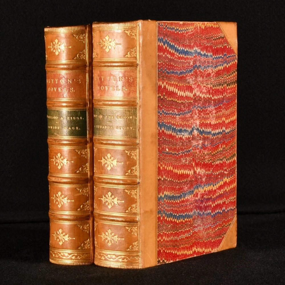 Click here to see our other books! Lord Lytton's Novels Edward Bulwer-Lytton 1840 George Routledge and Sons : London 7" by 5" SUMMARY A lovely set of sixteen novels in eight volumes by Lord Lytton. The cheap edition handsomely bound in half leather and marbled boards. Early Edition,Leather Binding,Pleasing Copy,Rebound Overall Condition: Very Good Indeed This book weighs 8 KG when packed UK Postage: £ 4.49 US Postage: £ 57.99 EU Postage : £ 33.99 European Postage: £ 59.99 Asia Postage: £ 99.99 Worldwide Postage: £ 199.99 DESCRIPTION The Knebworth edition of this collection of novels by Edward Bulwer-Lytton. Dated from copies from the same edition on Jisc c1875. Sixteen volumes bound in eight. A handsome set bound in leather and marbled boards of this collection of novels by the noted English writer and politician. he coined famous phrases such as "the great unwashed," "the pen is mightier than the sword," "dweller on the threshold," and the opening phrase "it was a dark and stormy night." Comprising Pelham, Eugene Aram, Ernest Maltravers, Alice, The Parisians (in two volumes), Kenelm Chillingly, Pausanias: The Spartan, Disowned, Devereux, Last Days of Pompeii, Godolphin, Last of the Barons, A Strange Story, Falkland and Zicci , and Coming Race. These volumes were bound in without the frontispieces. CONDITION In a half calf binding with marbled boards and edges, five raised bands, and gilt decorations to the spine. Externally excellent with only minor shelf wear. Internally, firmly bound. With a faint minor scattered spotting to the occasional leaf, particularly to the first and last few; otherwise, the pages are generally bright and clean throughout. Lacking the frontispieces. Overall Condition: Very Good Indeed GLOSSARY OF TERMS Overall Condition (Dustwrapper condition rating is shown after that for the book itself, where a dustwrapper is present) Fine - Very well preserved copy showing very little wear Very Good Indeed - Only one or two minor faults, really a very attractive copy Very Good - Quite a wide term meaning no major faults but probably several smaller ones often expected given the age of the book, but still a respectable copy Good - Meaning not very good. Some more serious faults as will be described in the condition report under 'condition' Good Only - Meaning one or more faults that could really do with repair Fair - As with good only above but with other faults leaving a compromised copy even after repair Poor - Really bad and possibly seriously incomplete. We only sell books in this condition where their rarity or value makes them attractive none the less. Major defects will be described. GUARANTEE We offer a full money back guarantee on our descriptions. Please ask for details and conditions. We prefer PAYPAL. If you pay via PAYPAL we will post the item off the same or the next working day with the postage you have selected. Please note we cannot accept USD cheques