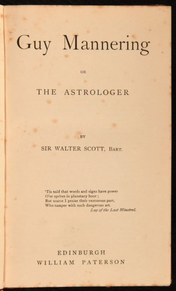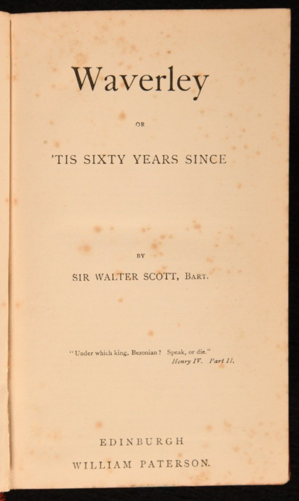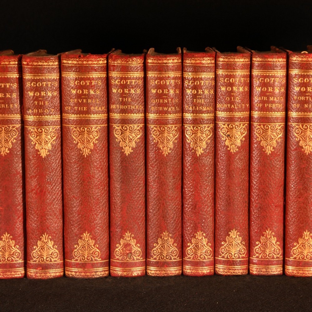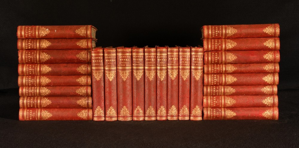 Click here to see our other books! The Waverley Novels Sir Walter Scott c1887 William Paterson : Edinburgh 6.5" by 4" SUMMARY A complete 25 volume collection of Sir Walter Scott's popular 'Waverley Novels', bound in quarter morocco. Leather Binding,Original Binding Overall Condition: Very Good This book weighs 7 KG when packed UK Postage: £ 4.49 US Postage: £ 52.99 EU Postage : £ 30.99 European Postage: £ 55.99 Asia Postage: £ 89.99 Worldwide Postage: £ 189.99 DESCRIPTION The 'Edinburgh Edition'. Bound in quarter morocco with cloth to the boards. A complete twenty-five volume set. This set features a collection of the 'Waverley novels', which are a long series of novels by Sir Walter Scott. They were the most popular and widely read novels in Europe for almost a century. The series was titled Waverley, after the first novel of the series, as Scott did not claim authorship until 1827. Prior to Scott's acknowledgement of his authorship the novels were stated as 'by the author of Waverley' to their title pages. Sir Walter Scott was a historical novelist, playwright and poet. Aside from his writings he was an advocate, judge and legal administrator. This set includes; Waverley, Woodstock, The Betrothed, Peveril of the Peak, The Abbot, Rob Roy, St Ronan's Well, The Fortunes of Nigel, The Fair Maid of Perth, The Talisman, Quentin Durward, Old Mortality, Count Robert of Paris, The Heart of Midlothian, Ivanhoe, The Pirate, Guy Mannering, The Antiquary, A Legend of Montrose with The Black Dwarf, The Bride of Lammermoor, The Monastery, Anne of Geierstein, Kenilworth, The Surgeon's Daughter with Castle Dangerous and Redgauntlet. Undated. Dating by copies held by the British Library. CONDITION Bound in quarter morocco with cloth to the boards. Externally smart with slight rubbing and bumping to the extremities, slight fading and rubbing to the spines, marks to the boards, a closed tear to the leather to the front joint to 'Waverley' and 'Ivanhoe', with the front joint tender to 'Redgauntlet'. Damp stain to the front board to 'Ivanhoe'. The odd minor spot to the endpapers. Internally firmly bound with generally bright pages with the odd spot, heavier to the front and rears and the slightest age toning. Overall Condition: Very Good GLOSSARY OF TERMS Overall Condition (Dustwrapper condition rating is shown after that for the book itself, where a dustwrapper is present) Fine - Very well preserved copy showing very little wear Very Good Indeed - Only one or two minor faults, really a very attractive copy Very Good - Quite a wide term meaning no major faults but probably several smaller ones often expected given the age of the book, but still a respectable copy Good - Meaning not very good. Some more serious faults as will be described in the condition report under 'condition' Good Only - Meaning one or more faults that could really do with repair Fair - As with good only above but with other faults leaving a compromised copy even after repair Poor - Really bad and possibly seriously incomplete. We only sell books in this condition where their rarity or value makes them attractive none the less. Major defects will be described. GUARANTEE We offer a full money back guarantee on our descriptions. Please ask for details and conditions. We prefer PAYPAL. If you pay via PAYPAL we will post the item off the same or the next working day with the postage you have selected. Please note we cannot accept USD cheques