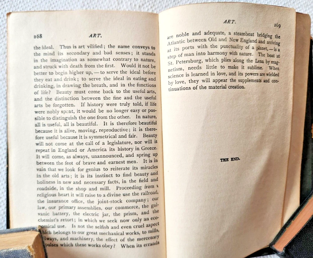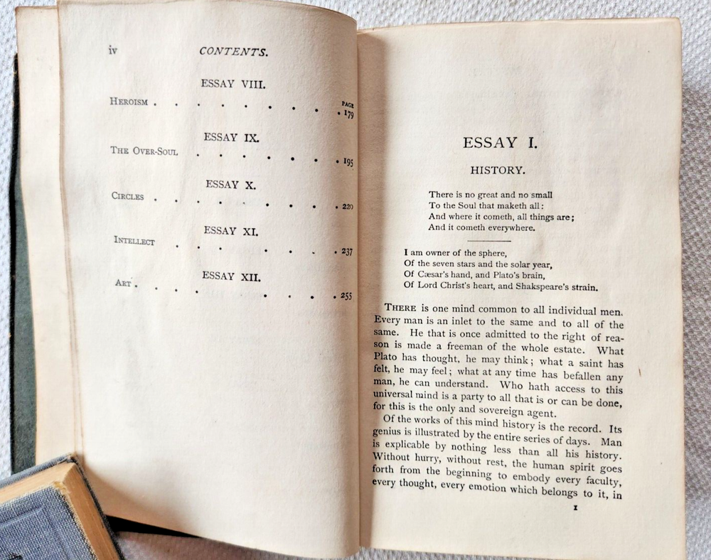 This is an original Volume 1 First Series of "The Essays of Ralph Waldo Emerson" published by T.Y. Crowell & Co in New York, NY in 1883. The book is bound in leather with gold lettering. It contains essays by Ralph Waldo Emerson on various subjects making it a classic piece of North American literature. 269 pages. SHIPS WITHIN THE U.S., MONDAY THRU FRIDAY, NON-HOLIDAYS YOUR INTEREST IS APPRCIATED FROM FAMILY ESTATE