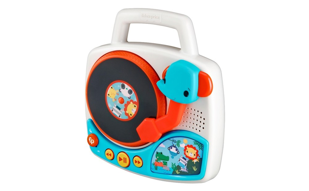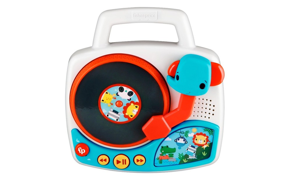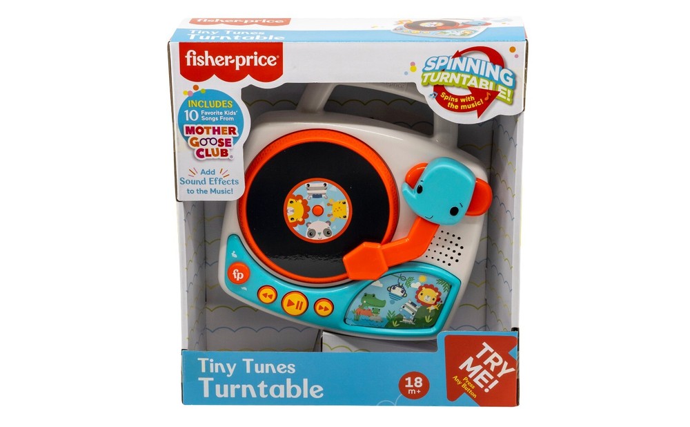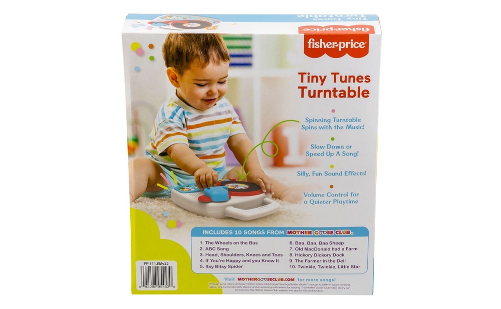 - Toy turntable spins along to built-in music - Includes 10 songs from Mother Goose Club - Add fun, silly sound effects while you play - Volume control for a quieter playtime - Designed for children 18 months and up This Fisher Price Tiny Tunes Turntable is packed with popular nursery rhymes for toddlers! Just press Play and sing along to 10 built-in songs from Mother Goose Club: - The Wheels on the Bus - ABC Song - Head, Shoulders, Knees and Toes - If You’re Happy And You Know It - Itsy Bitsy Spider - Baa Baa Black Sheep - Old MacDonald Had a Farm - Hickory Dickory Dock - The Farmer In the Dell - Twinkle, Twinkle, Little Star