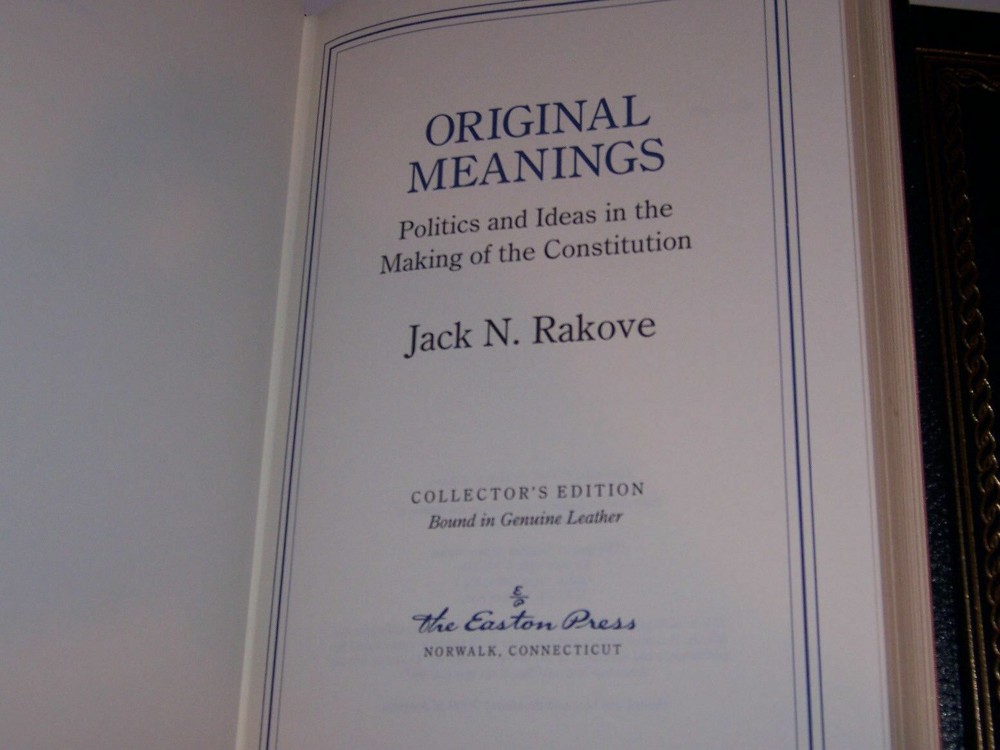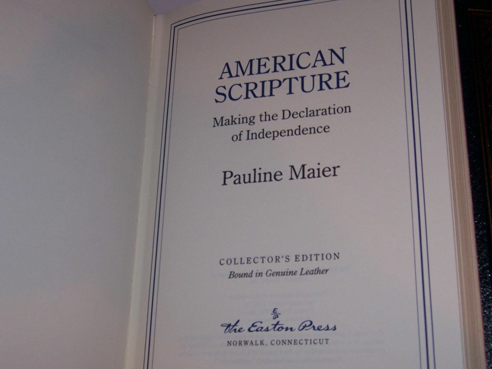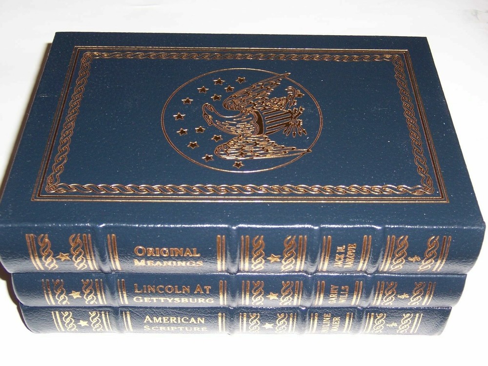 Books from Easton Press Bound in premium leathers, distinctive cover design, hubbed spine accented in 22-karat gold Endsheets of rich moire fabric, permanent satin ribbon page marker Thread sewn pages for strength and durability, gilded page edges for beauty and protection Handsome readable typefaces, beautiful illustrations, archival-quality acid-neutral paper TITLE AMERICAN SCRIPTURE series in 3 volumes AUTHOR --- MORE DETAILS Blue leather hardcover with decorative front board and spine: 1. AMERICAN SCRIPTURE: Making the Declaration of Independence, by Pauline Maier 2. LINCOLN AT GETTYSBURG: The Words that Remade America, by Garry Wills 3. ORIGINAL MEANINGS: Politics and Ideas in the Making os the Constitution, by Jack N Rakove DESCRIPTION like new and unread condition, clean inside, tight hardcover binding SHIPPING Books will be packed safely, and shipped via USPS Media Mail with tracking number.