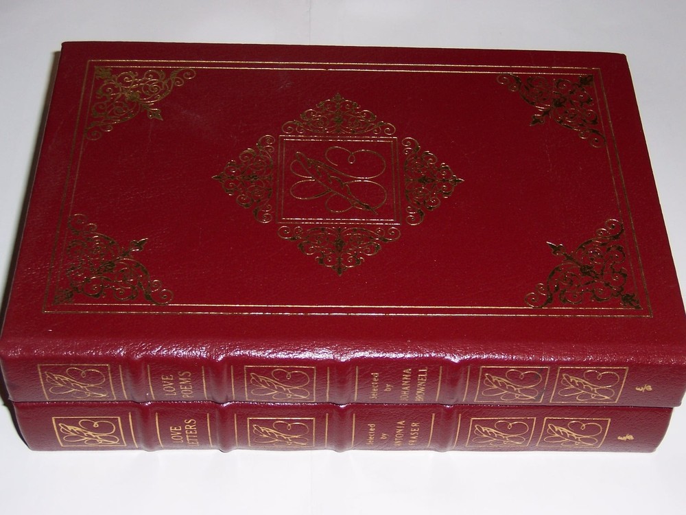 Books from Easton Press Bound in premium leathers, distinctive cover design, hubbed spine accented in 22-karat gold Endsheets of rich moire fabric, permanent satin ribbon page marker Thread sewn pages for strength and durability, gilded page edges for beauty and protection Handsome readable typefaces, beautiful illustrations, archival-quality acid-neutral paper TITLE LOVE LETTERS & POEMS 2 vols AUTHOR selected by Antonia Fraser & Johanna Brownell MORE DETAILS Black leather binding, with matching hardcover design DESCRIPTION Very good condition, some scratches/ marks to gilts edges, unread, clean inside, tight hardcover binding SHIPPING Books will be packed safely, and shipped via USPS Media Mail with tracking number.