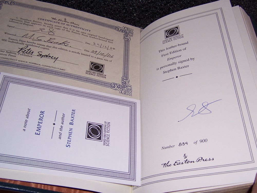 Books from Easton Press Bound in premium leathers, distinctive cover design, hubbed spine accented in 22-karat gold Endsheets of rich moire fabric, permanent satin ribbon page marker Thread sewn pages for strength and durability, gilded page edges for beauty and protection Handsome readable typefaces, beautiful illustrations, archival-quality acid-neutral paper TITLE EMPEROR Time's Tapestry 1 AUTHOR Stephen Baxter MORE DETAILS Signed First Edition, signed by Stephen Baxter, frontispiece by Walter Velez DESCRIPTION Like new condition, unread, clean inside, tight hardcover binding SHIPPING Books will be packed safely, and shipped via USPS Media Mail with tracking number.