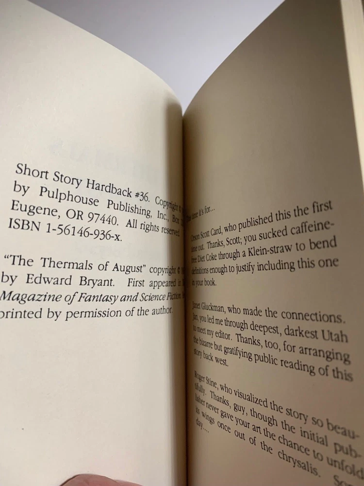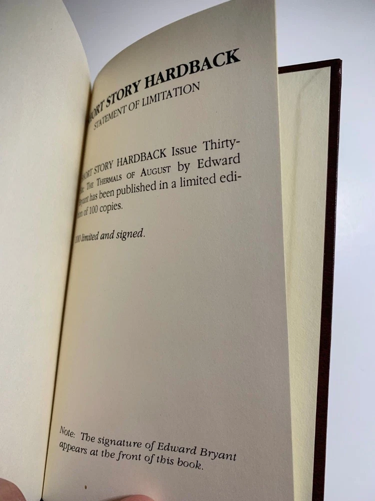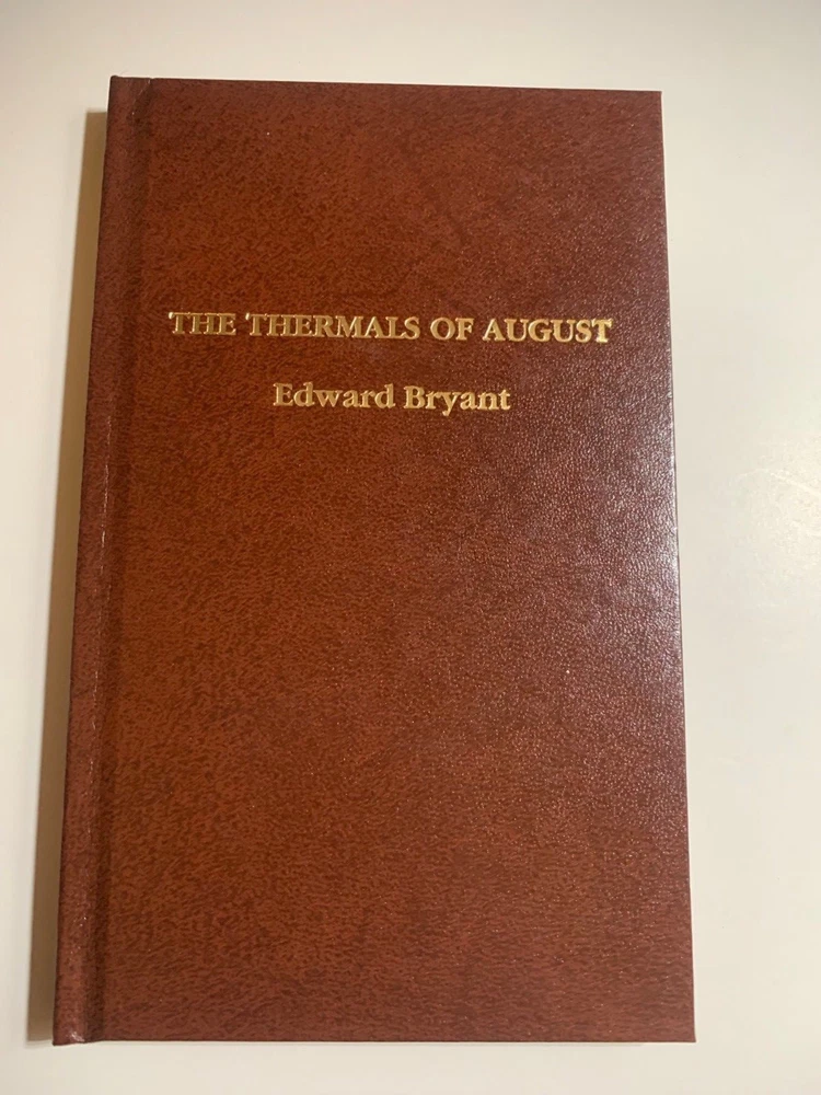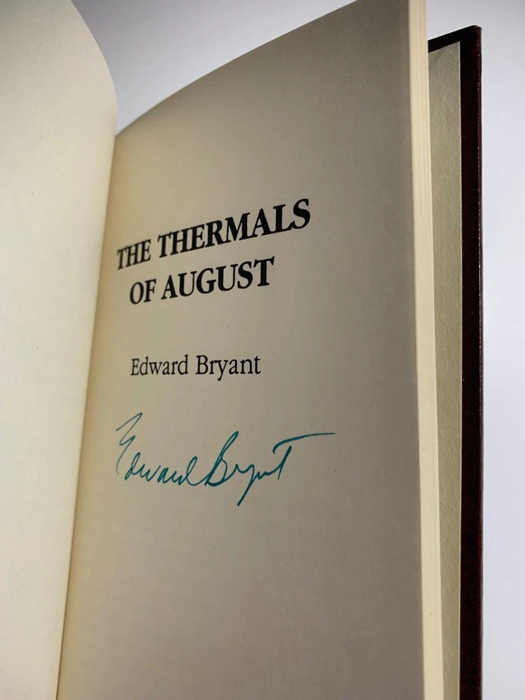 Edward Bryant. The Thermals of August. Pulphouse. 1992. 53 pages. Signed limited first edition leather bound. One of 100 copies of the Short Story Hardback Series. These hardbound books are small in size and measure aprox. 4.25" X 7". Fine and unread. As new. Shelf 10; 2@37. We usually ship books within 1 business day. All our books are shipped in boxes! About Us We have over seventy years combined experience buying, selling, collecting, shipping, and grading books. We are avid bibliophiles who rigorously grade our materials. If anything, we under grade. We love books, especially signed first editions, and we treat our books--eventually your books--with care and respect. Shipping All shipping costs are for inside the USA. For shipping outside of the USA, please contact us first. All books are packaged extremely well to preserve the book's condition. All books are shipped with USPS tracking via Media Mail unless other arrangements are made. Books are shipped within 3 business days of payment clearing. Returns If the book arrives and you have questions or concerns, please contact us immediately so we can work things out. If the condition is not as described, we are happy to refund your money and shipping both ways. If you simply want to return the book because you do not want it anymore, we will refund the purchase price of the book but not shipping. All returns must be handled within 30 days of receiving the book. Again, if you have any questions, please contact us immediately. Pulphouse Axolotl