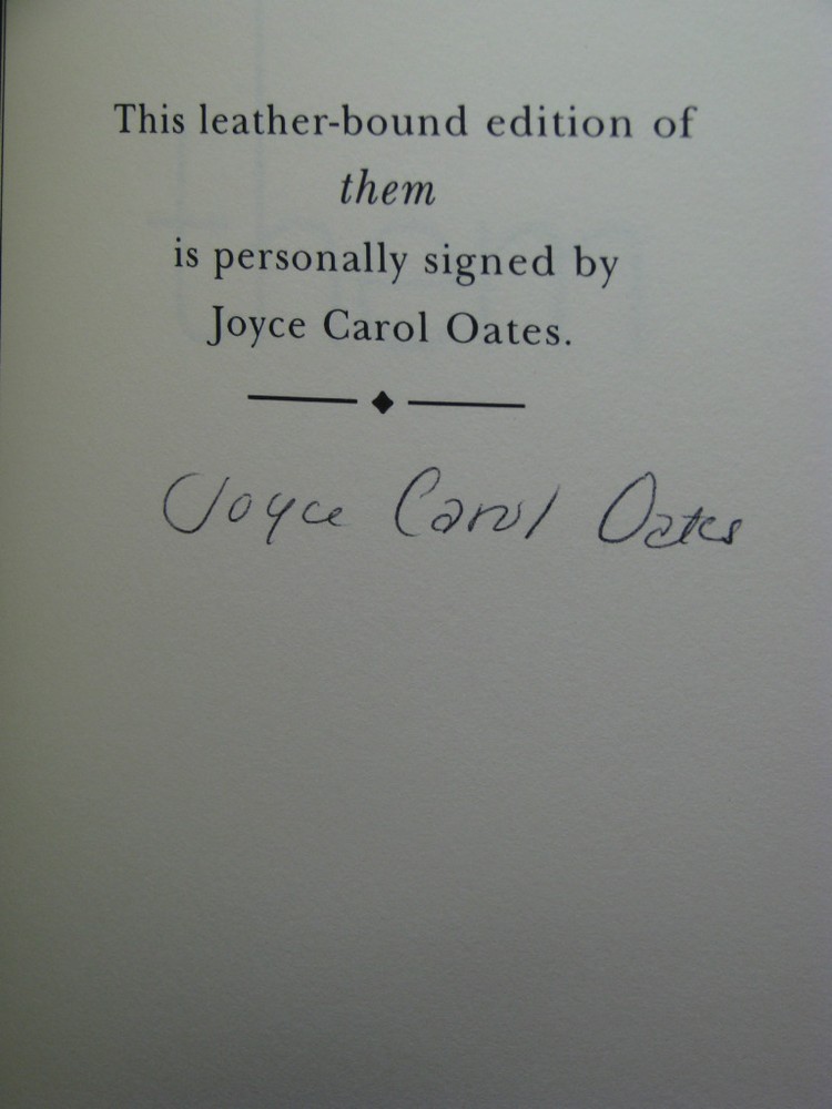 them by Joyce Carol Oates (signed) Easton Press Collector's Edition Description: Leatherbound hardback book published by Easton Press. Bound in top grade dark red leather with 22kt gold lettering and cover artwork. Hubbed spine, acid neutral paper with page edges gilded, satin moire endpapers, and a satin ribbon book mark sewn in. Collectors note, certificate of authenticity and unused publisher supplied bookplate laid in (not attached). Issued by Easton Press signed by the author on a special signature page without inscription or personalization. Issued by Easton Press as part of the Signed Modern Classics series. Book Description: Winner of the National Book Award and in print for more than thirty years, them ranks as one of the most masterly portraits of postwar America ever written by a novelist. A novel about class, race, and the horrific, glassy sparkle of urban life, them chronicles the lives of the Wendalls, a family on the steep edge of poverty in the windy, riotous Detroit slums. Loretta, beautiful and dreamy and full of regret by age sixteen, and her two children, Maureen and Jules, make up Oates' vision of the American family - broken, marginal, and romantically proud. The novel's title, pointedly uncapitalized, refers to those Americans who inhabit the outskirts of society--men and women, mothers and children--whose lives many authors in the 1960s had left unexamined. Alfred Kazin called her subject "the sheer rich chaos of American life." The Nation wrote, "When Miss Oates' potent, life-gripping imagination and her skill at narrative are conjoined, as they are preeminently in them , she is a prodigious writer." Condition: Binding - fine, like new. Dust jacket - none, as issued. Our Business Policies: Use the Contact Seller link near the top of this listing to see our FAQs, which should answer most questions about our business and listing policies. We have moved the extensive text we used to have here to those FAQs. Shipping and Packing: General Information: We always ship in sturdy new boxes with premium heavy duty packing tape, bubblewrap and filler to keep the item(s) away from the sides of the box. The pictures below show the boxes that we use for shipping. A Note On Customs: When customs forms are required for a shipment, we fill them out honestly, stating that the contents are merchandise and giving the price you paid for the item (not including the shipping) as the value. Please do not ask us to do otherwise. Take any customs duty that you will have to pay into consideration before making your purchase. Please note that many countries have restrictions on the import of certain goods and sometimes on the maximum value that can be shipped to the country by various shipping methods. Priority Mail International insurance cannot be purchased for all countries and some limit the amount of insurance that can be purchased (default indemnity coverage seems to apply to all countries). Details on shipping conditions by country can be found on the United States Post Office web site.