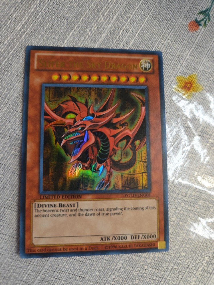 Slifer the Sky Dragon, card number YGLD-ENG01, is a rare and limited edition card from the Yu-Gi-Oh! TCG. This card features a holographic finish and depicts a powerful sky dragon creature/monster. The card is made of card stock material and is in the English language. It is suitable for ages 4 and up and has a standard card size. This rare card was manufactured by Kazuki Takahashi in 1996 and is a must-have for any serious collector of CCG individual cards.