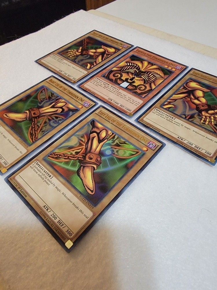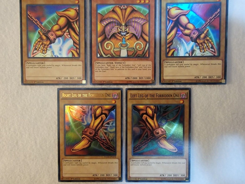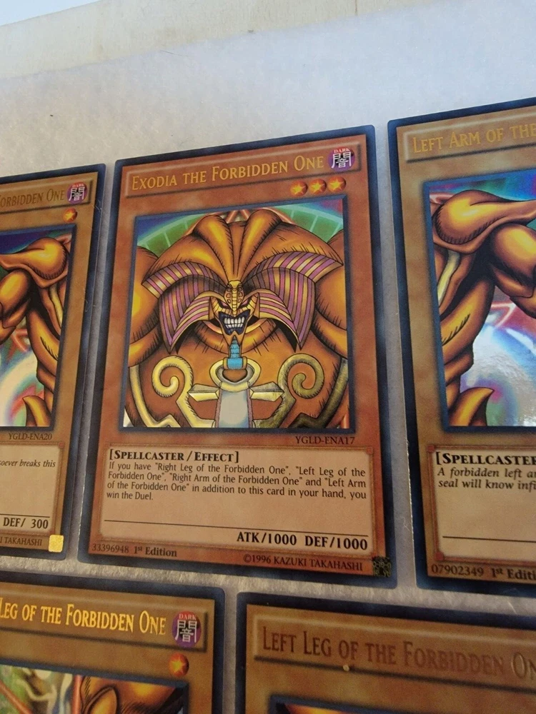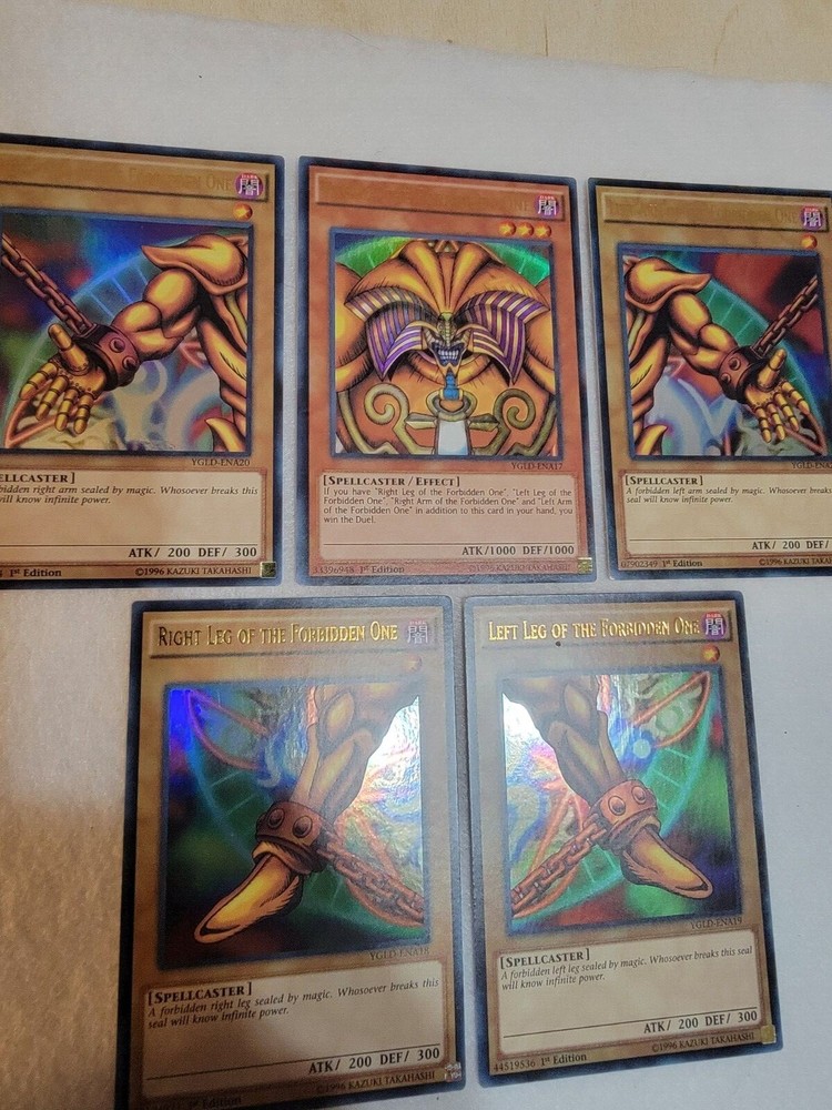 yugioh playing card game, exodia the forbidden one 1st edition. YGLD-ENA17 YGLD-ENA18 YGLD-ENA19 YGLD-ENA20 YGLD-ENA21 card are as is, no returns. thank you