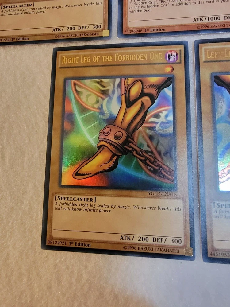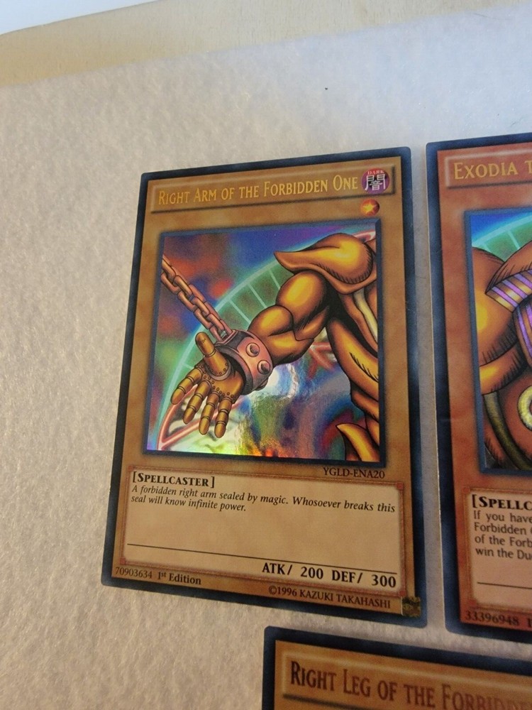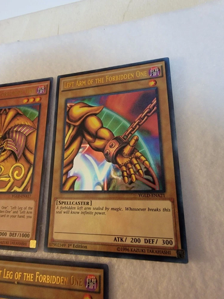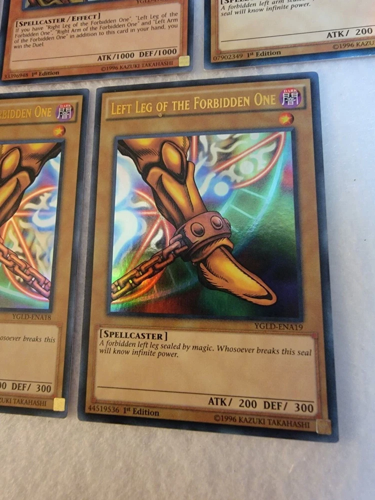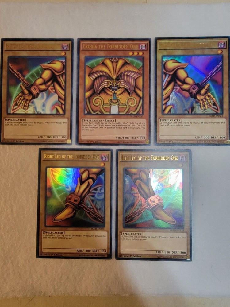 yugioh playing card game, exodia the forbidden one 1st edition. YGLD-ENA17 YGLD-ENA18 YGLD-ENA19 YGLD-ENA20 YGLD-ENA21 card are as is, no returns. thank you